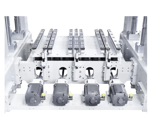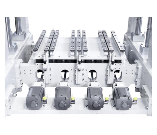 sistem se lahko prilagodljivo prilagaja različnim proizvodnim potrebam za betonske izdelke. ● Osem vibracijskih enot z mehanskim ravnovesjem, ki ga individualno nastavi osem servo pogonov ● Osem motornih gredi z elastičnimi spojkami ● Osem servo motorjev, vsak nameščen na zunanjem prečnem nosilcu za izolacijo vibracij na okvirju motorja ● Vibracijska miza ne potrebuje oljne kopeli (okolju prijazno)