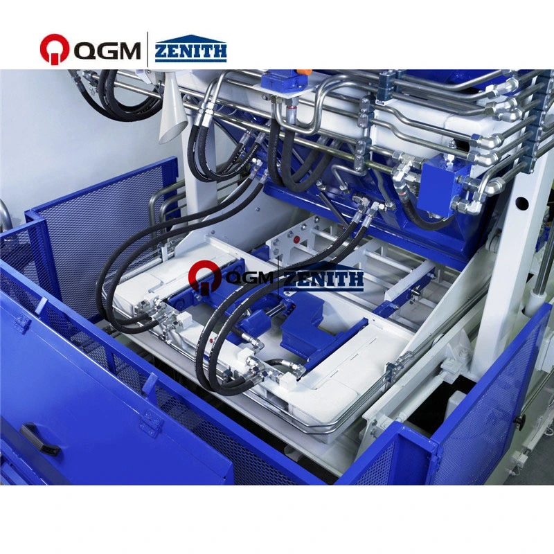 (3) Visoko učinkovit sistem vibracij. Vibracijska miza je zasnovana tako, da ima štiri različne proizvodne ravni; Zgornji del vibracijske mize je dvodelni, da se doseže enakomeren prenos moči in optimalno zbijanje; Zamenljiva obrabna plošča za zaščito zgornjih delov vibracijske mize; Vibracijska miza za sprejem dveh vibratorjev za doseganje največje centrifugalne sile 80 kN; za izdelavo 50 cm visokih blokov je okvir kalupa opremljen z vibratorji. (Lahko je opremljen z 2, 4, 6.8 vibratorji glede na višino bloka), Vibracijski motorji uporabljajo servo motorje.